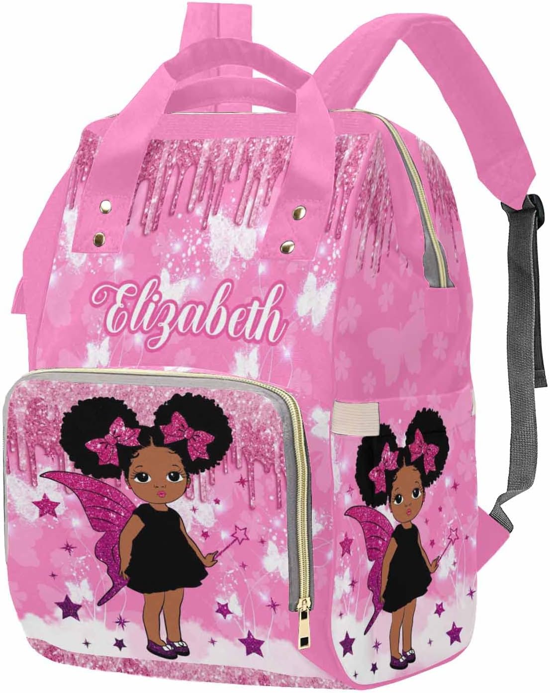 Diaper Bag Backpack Personalized with Name for Mom & Dad, you can personalize the name what you need anytime. Nylon Material: Oxford and nylon fabric, makes the mom dad diaper bag durable. Baby bag with smooth zipper, sturdy inner lining, delicate reinforced stitches.Large Capacity: Custom Name diaper backpack with a main compartment and some different separate pockets inside, which can store different things, daily necessities. Item size: 10.8"(L) x 6.9"(W) x 15.75"(H).Multi-function Design: Front compartment includes 3 insulated pockets and one mesh compartment, the milk bottles can be placed in the insulated pockets. The other big compartment inside designed by absolute 4 pockets and one zipper pocket, so that you could put different things and keep them organized. Diaper bag also with 2 side pockets.Adjustable Straps: Make you more comfortable and stable while you carrying the personalized name diaper bag backpack.Waterproof: The Water resistant outer material of personalized diaper bag to protect your daily goods and the inner lining can be wipeable.