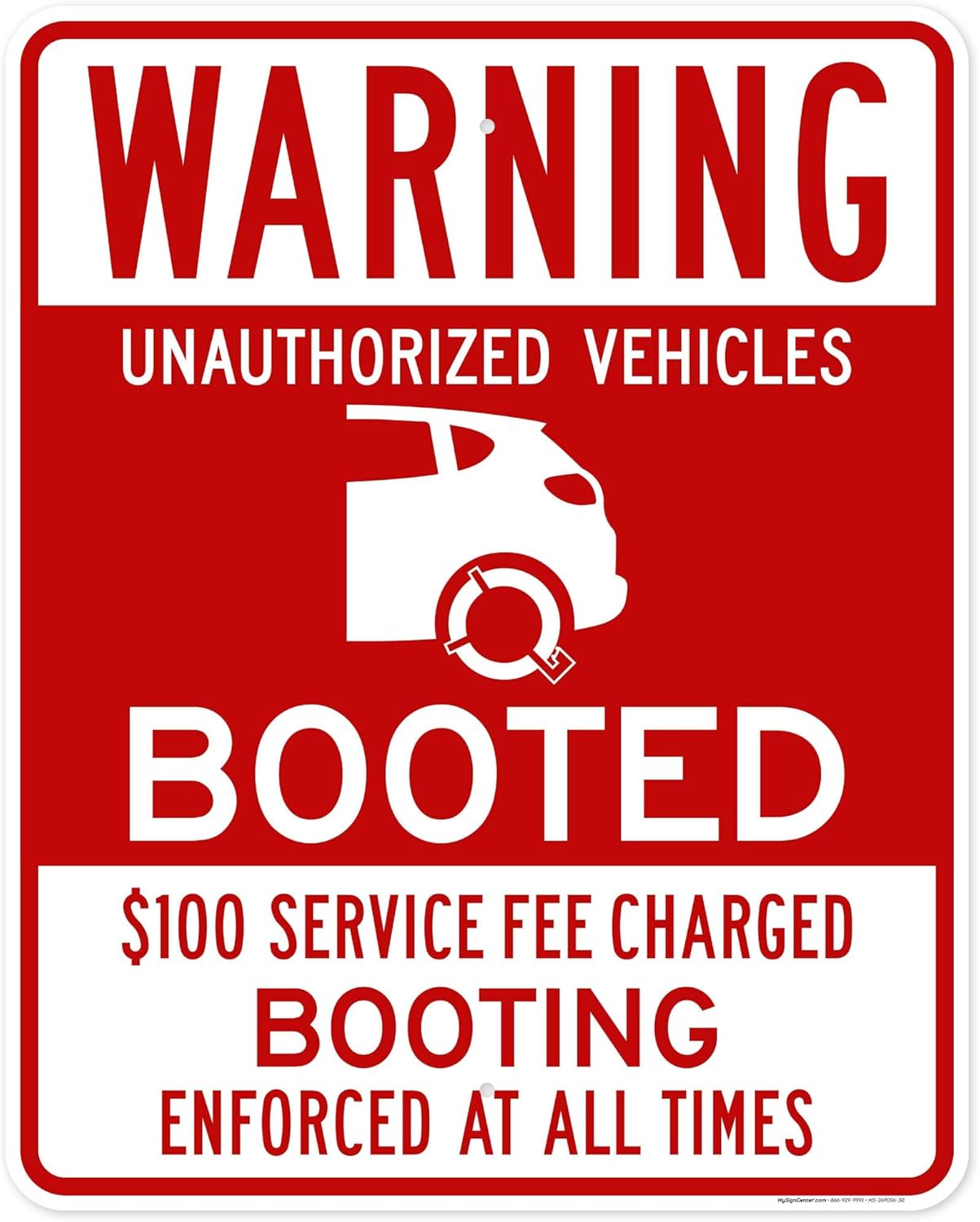 Warning Unauthorized Vehicles Booted 100 Service Fee Charged Booting Sign, 18x24 Inches, Rust Free .063 Aluminum, Fade Resistant, Made in USA by My Sign Center